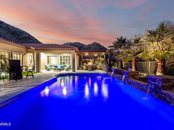 This 4-bed (3 bed + 1 fully-enclosed den + 1 bonus room), 2.5-bath home is in a secure gated community near South Mountain trails. Surrounded by scenic views, the resort-style backyard features premium pavers, a ramada-covered outdoor kitchen with pellet grill, sink/cooler, 2-drawer fridge, 8' bar, & a 6' fire feature - an entertainer's dream! The primary suite includes private patio access and a spa-inspired bath with dual shower heads & zero-entry glass shower. Inside boasts new flooring, updated baths & laundry, new appliances, & fully replaced HVAC, water heater, & softener. Every inch is dialed in—move-in ready and made for entertaining.