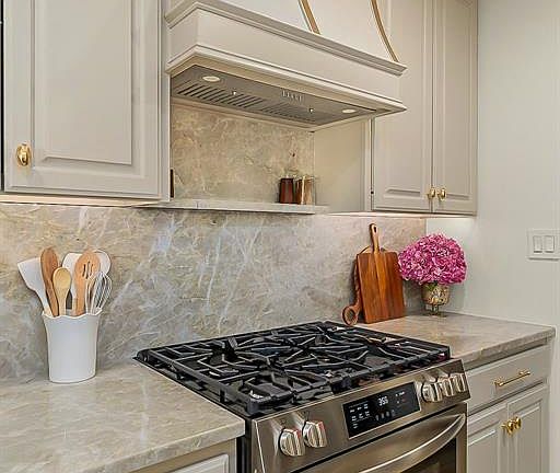 The kitchen boasts natural quartzite countertops, full-height backsplash, custom hood, gas range, solid brass hardware, soft-close cabinetry, & a pantry with deep pull-out drawers & elegant French Cremone Bolts. The main-floor laundry offers abundant storage & stylish wallcoverings. Luxury vinyl plank flooring covers both floors, complemented by designer carpet on stairs, 5.25" baseboards, Visual Comfort lighting, smart thermostat, & fresh paint.