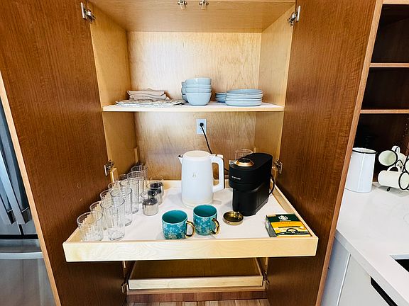 The chef's kitchen is a masterpiece, featuring floor-to-ceiling European cabinetry that provides ample storage with sleek, modern appeal. A center island doubles as a meal prep station and dining space, complemented by an electric stove, a microwave that serves as a second oven, a counter-depth refrigerator, and a dedicated coffee bar an entertainer's dream.