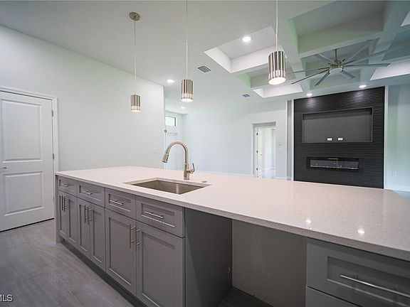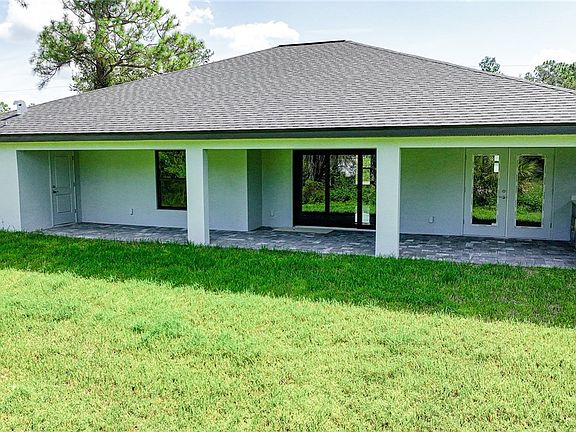 Newly built single-family home on a half-acre, features 3 bedrooms plus a den, 3 full bathrooms, an open-concept floor plan with two master suites, each with walk-in closets and frameless glass showers, the home includes high-impact doors and windows, tile flooring throughout, an elegant electric fireplace, solid wood cabinetry, spacious kitchen island with quartz countertops, and stainless steel appliances, two pantries, a large lanai with an outdoor summer kitchen, include a BBQ grill and mini fridge, a 2-car garage, an oversized 20' x 50' paver driveway. also Floratam sod and a full irrigation system.