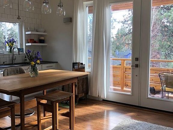 This 1-year old studio apartment was carefully designed for a spacious, comfortable, and modern ambience. It has vaulted ceilings, sky lights, large south-facing windows, a modern fireplace, AC, stainless steel appliances (including a built-in microwave), a walk-in closet, built-in storage, a window seat, a Murphy bed, and a 21-foot long covered porch with views of old growth Ponderosa pines and Overturf Butte. It also has outdoor storage (6'x15') and a shed (3'x7'). It is ideally located, about two blocks west of Parilla Grill, and is walking distance to downtown, Galveston Avenue, Old Mill, and NW Crossing. It is also half a block from trails that go all the way to Bachelor. Owner pays for garbage and water, and renter pays for gas and electric, which are inexpensive since it is new construction and small. The lease is month to month. No smoking is allowed. Dogs certified as canine good citizens are welcome with an additional deposit and maybe cats (let's discuss).