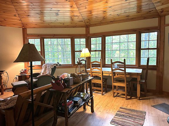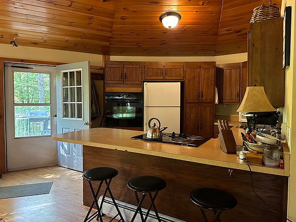 Significant price adjustment! Nicknamed the Octagon House, but it is really 12 sided. This is a fun house set well back from the town-maintained gravel road on a neat one-acre lot. The privacy of this setting is a real surprise. There's a nice lawn area, perfect for volleyball or corn hole, complete with a fire pit. Entrances on the lower level into a mudroom which has room to add cubbies or off the upstairs deck into the kitchen. The living/dining area has a wood stove and a big picture window to enjoy your setting from the inside, too. Two bedrooms and a full bath upstairs. A spiral staircase to the newly renovated lower level. There is a good sized bonus room which is big enough to create a third bedroom and still have a second sitting area. I could see the play crowd downstairs and the folks enjoying a good book relaxing upstairs. The lower level has nice pine walls, new windows and new 3/4 bath. The utility room offers storage, laundry and mechanicals which includes an up-to-date Buderus boiler. You may make some cosmetic updates upstairs, but it comes fully furnished and you can begin enjoying things on day one! There's a small barn in need of a new roof, but a good place to store your bikes, snowmobiles and kayaks. South Hill is quiet and just a couple of miles from town. You will enjoy skiing, the lakes, golf, biking, hiking and more, all right here in town. It doesn't get much better. Is this your new home?