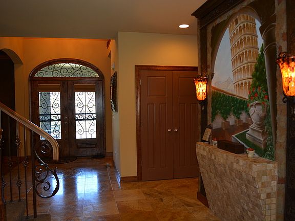 Just Listed! Beautiful home with many extras including marble flooring, stained glass murals, painted murals, granite countertops, large main bathroom, large media room with attached sitting room including wetbar, ornate fixtures,Stained wood cabinets, tile backsplash, distressed wood flooring and some wood plank ceiling. Plenty of room for growing into with large unfinished walk out basement. Home includes zone heating, and built in storm shelter Paradigm surround sound media room (estimated $10k).GE appliances in kitchen include refrigerator, dishwasher, electric warming drawer, convection wall oven and dual microwave/oven. This one is a must see!
