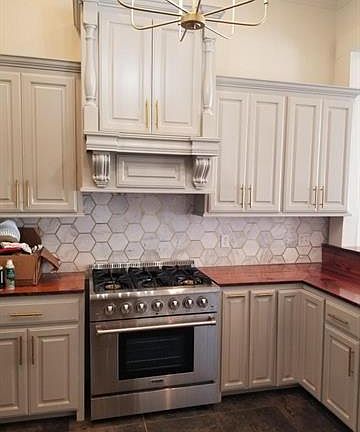 Stainless steel appliancesGas rangeOpen living conceptSpacious kitchenBreakfast barHardwood floorsExposed brick