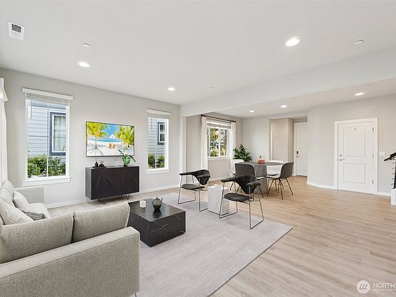 Located in the heart of Mill Creek! This stunning two-story Blue Jay floor plan is perfectly situated on the pond and offers breathtaking views of Mt. Rainier and private pond! Incredible westerly exposure that floods the great room and kitchen with natural light. The gourmet kitchen is a chef’s dream—featuring a large island with seating, sleek quartz countertops, 42" stained Beech cabinets, a deep undermount sink, full-height tile backsplash, and stainless steel appliances. Retreat to the luxurious primary suite, where the spa-like bath includes dual vanities, a large soaking tub, and separate shower. Additional highlights include central air conditioning and beautifully curated finishes throughout. 2-car garage, and trails throughout!