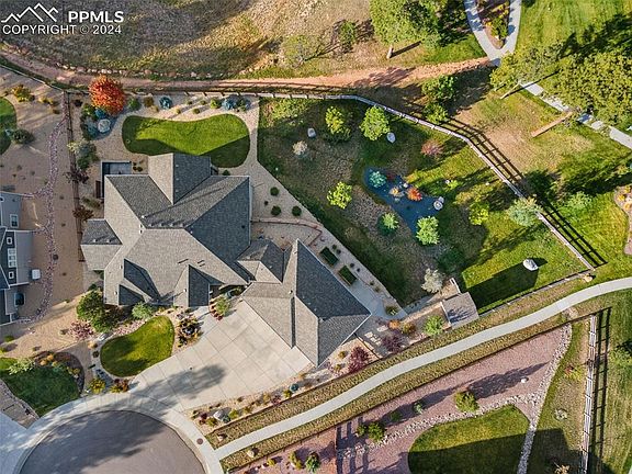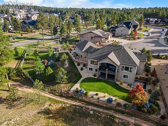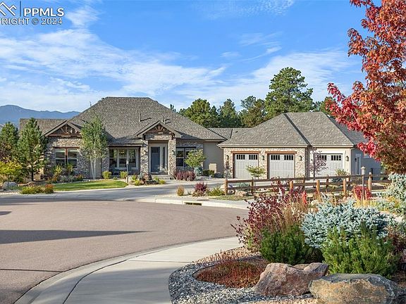 Experience luxury living in this Sanctuary Pointe estate, perfectly positioned at the end of a cul-de-sac, nestled on a sprawling half-acre lot with great views of Pikes Peak and backing to open space. Designed for those who crave both elegance and convenience, this home offers direct access to walking paths, lush wooded surroundings, and the finest community amenities. Step inside to discover timeless sophistication with real hardwood floors and soaring vaulted ceilings in the main living area. The spacious family room, centered around a striking fireplace, opens to breathtaking mountain vistas, creating an ambiance of grandeur and comfort. The chef’s kitchen, complete with leathered granite countertops, a gas stove, double ovens, and a stylish beverage bar is ideal for culinary enthusiasts. At the heart of the kitchen lies an expansive island, perfect for gathering with family & friends, while the adjacent dining area boasts yet another stunning view. The master suite is a private sanctuary offering more panoramic views and a spa-like bathroom, featuring a dual-head shower and drying area. A second bedroom on the main level, a full bath with granite finishes, and a dedicated office provide the ultimate convenience. Downstairs, the walkout basement is a haven of comfort with three additional spacious bedrooms, a full bath, and ample storage. Step outside to the covered, heated deck and take in the serene surroundings. The meticulously landscaped backyard features a fire pit, hot tub hookup, dog run, and raised garden beds — perfect for outdoor living and relaxation. The over-sized, 1,100+ sq ft garage, complete with an epoxy floor and workbench, is a car enthusiast's dream. Live among the trees, immerse yourself in nature, and explore some of the county's best hiking trails, all within the exclusive Sanctuary Pointe community and nearby Fox Run Park. This home is more than just a residence, it’s a lifestyle tailored to those who desire the best of Colorado living.