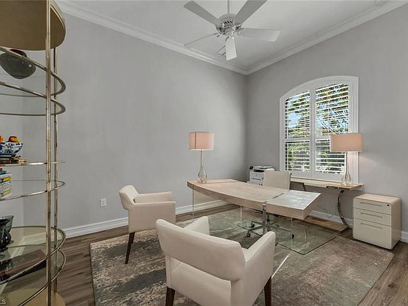 Marsilea is an 18 home gated enclave in North Naples. This home is privately located at the end of the cul de sac with greenery on one side and a beautiful fountain lake in the back. As you enter the home, a long gallery style hallway brings you into the open floor plan. The family and dining rooms feature a beautiful coffered ceiling. The kitchen is lit with hanging LED pendant lights over an oversized island. The kitchen includes stainless steel appliances, white cabinets, butler's pantry and a gas cooktop. The sliding doors to the lanai disappear to a screened private pool, spa with an outdoor grilling area. The lanai can also be entered from the large master bedroom. The master suite includes dual sinks, tub, glass enclosed shower and a large walk-in closet. For privacy, the 3 guest rooms are on the other side of home which include a jack and jill bathroom plus a lanai bathroom connected to a separate guest area. Additionally, impact resistant windows and doors, a walk-in laundry with a sink, 3 car garage, 500 gallon buried propane tank, a new whole home generator, new water softener and tankless hot water heater. Located in the school district for the NEW Aubrey Rogers HS.