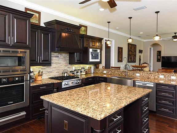 - Interior Features: Ceiling Fans(s), Eating Space In Kitchen, High Ceiling(s), Master Bedroom Downstairs, Open Floorplan, Split Bedroom, Stone Counters, Walk-In Closet(s), Solid Wood Cabinets, Thermostat, Kitchen/Family Room Combo, Living Room/Dining Room Combo, Tray Ceiling(s)