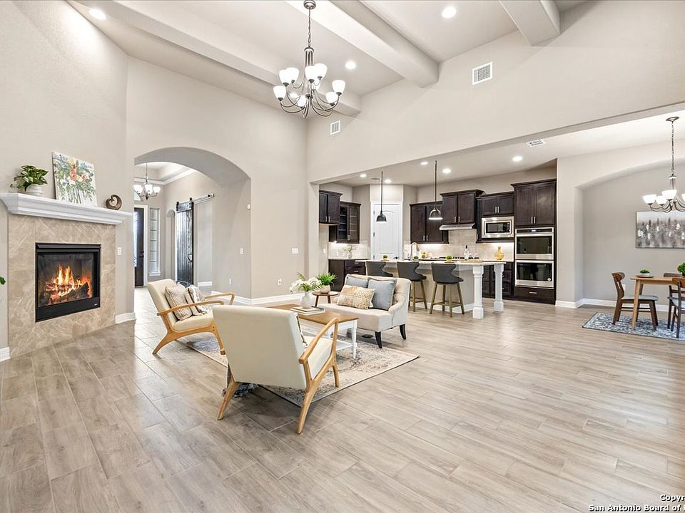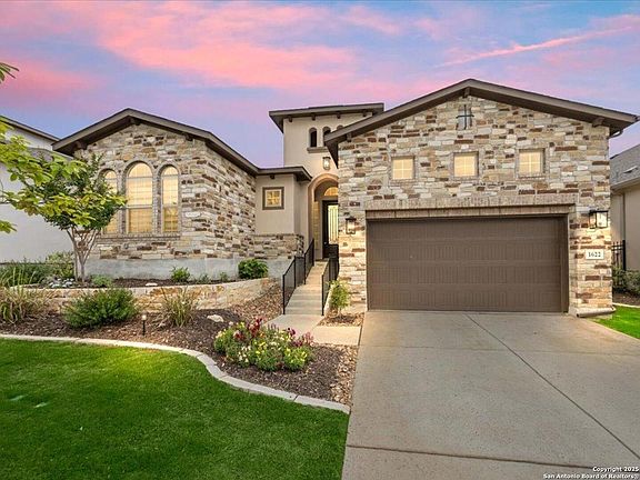 Nestled in the gated enclave of Settlers Ridge within Kinder Ranch, this home combines everyday comfort with a location that's hard to beat. Families will appreciate being in the highly rated Comal Independent School District, where elementary, middle, and high schools are just a short walk away-making mornings and afternoons a breeze. This property also offers a true Lock & Leave lifestyle. The HOA takes care of lawn service and seasonal landscaping, so you can travel or spend time away without worrying about exterior upkeep. Whether it's a weekend trip or an extended stay, you'll return to a yard that's beautifully maintained. The open-concept layout creates a seamless connection between the gourmet kitchen and living room, perfect for hosting friends or gathering with loved ones. The kitchen is designed for both function and style, featuring double Wi-Fi-enabled ovens, soft-closing cabinetry, and a spacious island for cooking or casual seating. High ceilings enhance the airy feel of the main living space, making it both inviting and practical. Thoughtful design extends throughout the home, with both a guest suite and a primary suite offering flexibility for visitors or multigenerational living. The owner's retreat features a spa-like shower with a rain shower head. The third bedroom offers plenty of possibilities, from sleeping quarters to a dedicated office. You decide what works best for you. A double-step water purification system adds another layer of comfort, ensuring fresh, clean water throughout the home. Car and hobby enthusiasts alike will appreciate the epoxy-coated garage floor, providing both durability and a polished finish. Step outside to a level backyard shaded by mature trees, where the covered porch invites you to enjoy weekend barbecues or peaceful mornings with coffee. Modern touches like dual-banded shades add a sleek finish and are easy to keep clean, while the community itself offers amenities including a pool, basketball court, and scenic walking trails. Conveniently located with quick access to back roads leading into downtown Bulverde, this home strikes the perfect balance of Hill Country charm and everyday practicality.