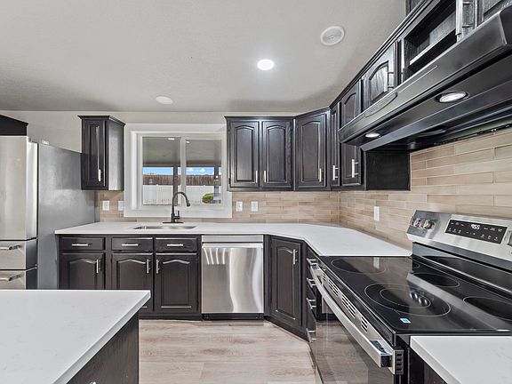 MLS# 288196 Check out this gorgeous ~1900 sq. ft. home that’s been completely updated! It features a NEW HVAC system and a massive oversized 2-car garage/shop with extra long driveway— perfect for vehicles, storage, or hobbies. Inside, you’ll find a stunning kitchen with new quartz counters, a modern tile back splash, brand-new appliances, island for eating/prep, and a butcher block pass-through bar. The spacious dining area easily fits a large table — ideal for family dinners or entertaining guests.The primary suite includes a huge his/hers walk-in closet and a spa-like bathroom with double sinks, jetted tub, beautiful tile shower, and even a bathroom pantry for extra storage. The other two other bedrooms share a fully remodeled bathroom. The laundry room has tons of cabinet storage and space for a 2nd fridge/freezer! Enjoy the outdoors in your fully fenced backyard with a covered patio — great for BBQs or relaxing evenings.The garage oversized, drywalled and painted, and finished with an epoxy floor! Other updates include new LVP flooring, carpet, trim, and doors, plus fresh paint inside and out. Move-in ready and full of modern touches — this one won’t last long!