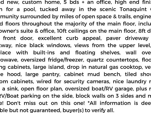 Brand new, custom home, 5 bds + an office, high end finishes, room for a pool, tucked away in the scenic Tonaquint Cove community surrounded by miles of open space & trails, engineered wood floors throughout the majority of the main floor, including the owner's suite & office, 10ft ceilings on the main floor, 8ft doors, iron front door, excellent curb appeal, paver driveway and walkway, nice black windows, views from the upper level, gas fireplace with built-ins and floating shelves, wall oven & microwave, oversized fridge/freezer, quartz countertops, floor-to-ceiling cabinets, large island, drop in natural gas cooktop, vented range hood, large pantry, cabinet mud bench, tiled showers, custom cabinets, wired for security cameras, nice laundry room with a sink, open floor plan, oversized boat/RV garage, plus room for RV/Boat parking on the side, block walls on 3 sides and much more! With a full price offer, Builder will either landscape the year and side yards OR contribute $10,000 towards buyer closing costs or rate buydown. Don't miss out on this one! *All information is deemed reliable but not guaranteed, buyer(s) to verify all.