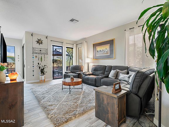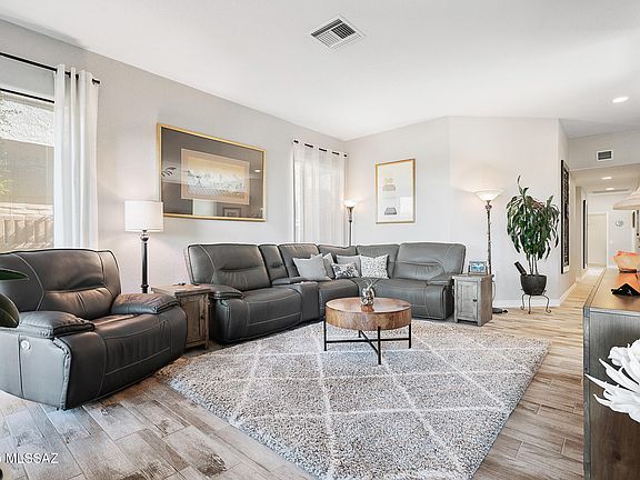 Realize the quintessence of retirement living in sunny Arizona, explicitly designed for active retirees looking to bask in the warmth and beauty of the Southwest. Imagine stepping through a captivating courtyard entrance, greeted by the verdant charm of lush greenery and the unique allure of an Elephant Foot Palm tree at your doorstep. This haven has been completely refreshed to provide a modern and inviting atmosphere, boasting wood-look tile flooring and soothing neutral paint colors that create a serene canvas for your personal touches. Step inside to an interior bathed in natural light, with 10-foot ceilings and floor-to-ceiling windows that frame the pristine natural desert landscape beyond. The expansive living area seamlessly transitions into an elegant dining room, offering the perfect space for hosting lively gatherings with friends. Here, the awe-inspiring views ensure that every meal is an occasion to be savored against a wonderful backdrop. The gourmet kitchen is a chef's dream, featuring pristine white cabinetry, lustrous quartz countertops, and a dazzling tile backsplash. Equipped with stainless appliances and ample pantry storage, this kitchen is both beautiful and functional. Retreat to the spacious owner's suite, a sanctuary of luxury with an extended dual-sink vanity and an exquisitely updated shower designed for peak relaxation and rejuvenation. Flexibility abounds with double doors that open to a den, third bedroom, or hobby room tailored to your unique lifestyle. Additionally, a cleverly converted garage space offers a heated and cooled office or hobby room, ensuring comfort and versatility year-round. Embrace the idyllic outdoor lifestyle with wrap-around brick patios offering unobstructed views of the sprawling desert that stretches for miles and the mountains to the Northeast. And you'll have the advantage of easy access to walking trails of the Canoa Hills Trails Park and the Canoa Hills Recreation Center - this home has it all! With its impeccable attention to detail and move-in readiness, it is the epitome of turnkey elegance for the discerning retiree. Welcome to your slice of Arizona paradise!