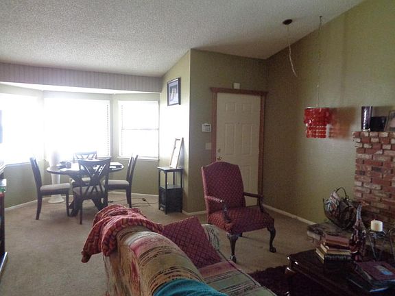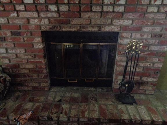 Single family home with brick pillars and RV access. Large living room with brick fireplace.