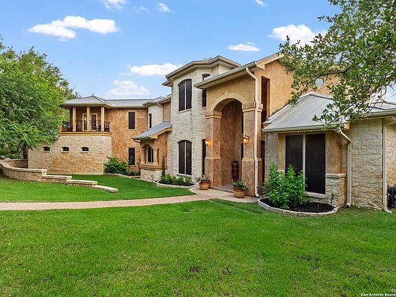 Experience the best of Hill Country luxury in this private 8.26-acre estate located in the exclusive gated community of Retablo Ranch. Built by J. Long Builder, this custom residence offers just under 6,000 sq. ft. of living space and embodies refined comfort, thoughtful design, and effortless entertaining. Inside, discover a spacious chef's kitchen featuring custom cabinetry, granite countertops, double ovens, gas cooking, and an oversized island that opens to the main living area. The primary suite on the main level is a serene retreat with a sitting area, private patio access, spa-inspired bath, and dual walk-in closets. Additional highlights include a formal dining room, study, multiple living spaces, an upstairs game room, and a stylish wet bar with a beverage cooler. Step outdoors to your private resort oasis complete with a beach-entry pool, waterfalls, water slide, spa seating, fire pit, and expansive covered patios. Enjoy an outdoor kitchen, shower, and cabana perfect for year-round entertaining. A detached air-conditioned workshop with three roll-up bays complements the double attached garage, offering ample space for vehicles, hobbies, or storage. Sustainability meets sophistication with fully paid solar panels, a Tesla Powerwall system, metal roof, and private well with aerobic septic. Additional upgrades include triple HVAC units and year-round decorative lighting for every occasion. Conveniently located near San Antonio and Boerne, yet tucked away for ultimate privacy. This property delivers the ideal balance of peace, performance, and prestige.