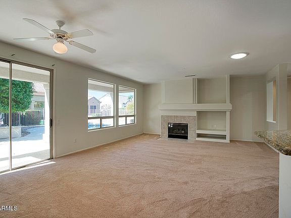 Light, bright and move-in ready home in the Mountain View neighborhood of Sun City Grand. Desirable split floor plan home with a great room that looks onto the relaxing pool and covered patio. Brand new, neutral carpeting in three rooms. New luxury vinyl flooring in several rooms. New baseboards throughout. New interior paint throughout most of the home. The roof underlayment was replaced in 2020. Newer water heater. Cozy gas fireplace at the living room. Spacious eat-in kitchen. The kitchen features a smooth-top range, built-in microwave and granite counters. The primary bedroom looks onto the pool and boasts a large walk-in closet, dual sinks at the bath and large shower. The office/den is a nice flex-space. Enjoy unmatched amenities at The Grand! Tinted windows and ceiling fans for energy efficiency. There is a quality golf cart that will be included with the sale at the right price. Carrier HVAC unit replaced in 2013. Don't miss this wonderful home!
