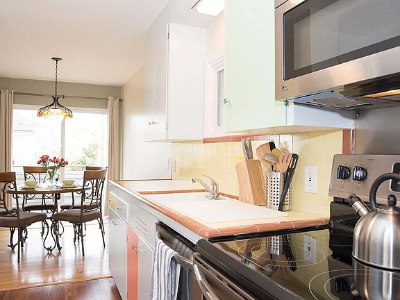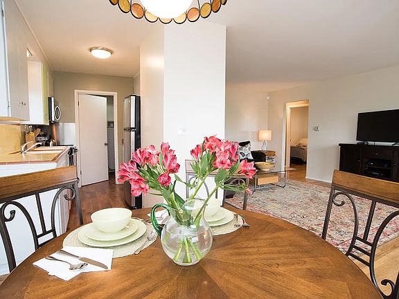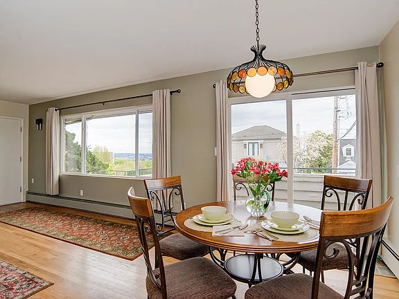 West Queen Anne two-bedroom/one-bathroom unit in a small mid-century building (4 units). The unit is located on the upper level and has spectacular views of South Lake Union and the Cascade Mountain. The apartment is very roomy with three closets near the kitchen, and a large closet on an entire wall in the master bedroom. There are hardwood floors throughout the entire unit. The new windows have double panes making the unit very energy efficient. The front door opens into a patio and a small garden area.