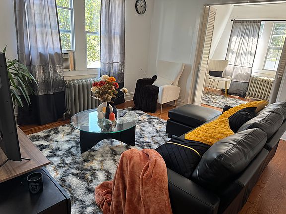 Welcome to The Greenleaf, a bright and airy 3 bed 1 bath home home vintage 2 flat in Evanston's artsy West Village neighborhood. This spacious 2nd floor unit hardwood floors throughout with 3 private bedrooms and a full bath with shower and tub. Each bedroom has a queen size bed, a closet plus a dresser, blackout curtains, and its own window AC. The enormous kitchen features a gas stove with griddle and is equipped with a food processor, mixer, air fryer and rice cooker - you can make ANYTHING in this kitchen! And the LOCATION is outstanding - it's an easy walk to several restaurants, the Valli grocery, Starbucks, and more. The Dempster Street bus line is just 2 blocks north - it will take you to either of the train lines that service Evanston and from there you can go ANYWHERE. Utilities and wifi are included, you'll find a 55" smart TV in the living room, bring your own subscription services. Pets are welcome. We will collect a $500 refundable pet deposit that will be returned when you move out, assuming no damage.