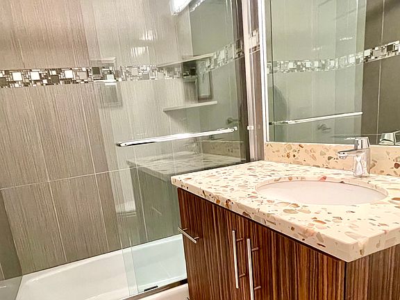 The bathrooms have extra high custom vanity counters and two kinds of custom floor to ceiling elongated stone wall and floor tiles with large mosaic tile surrounding bathtubs. Each bathroom has high-end GROHE bath fixtures.