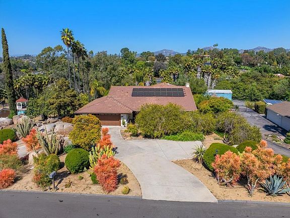 Fabulous Valle Verde Estates updated home on 0.96 acres with views of Mt. Woodson and surrounding mountains and hills! Beautiful backyard provides privacy and serenity and is perfect for entertainment and a relaxed home lifestyle. Outdoor patios and Trex-built decks provide expansive seating areas around built-in BBQ and nearby firepit. Elegant PebbleTec pool adds to the enjoyment (resurfaced in 2017, new pool heater in 2022). Kitchen has been remodeled with Shaker-style hickory wood custom cabinets, granite stone countertops, stainless steel appliances, gas cooktop, wine fridge, and a beautiful island with ample counter space that accommodates bar seating. Family room, dining area and nearby living room are adjacent to kitchen for enjoying gatherings with central entertaining area. Custom walk-in wine closet next to dining room. Private primary bedroom has lovely views plus an exquisite bathroom, remodeled with tile work, custom double vanity cabinets, and a spacious walk in-closet. Two upstairs secondary bedrooms also have walk-in closets and plenty of storage space. Large laundry / work out / craft room is accessible through garage. Solar is owned. Experience a slice of paradise with this lovely custom home!