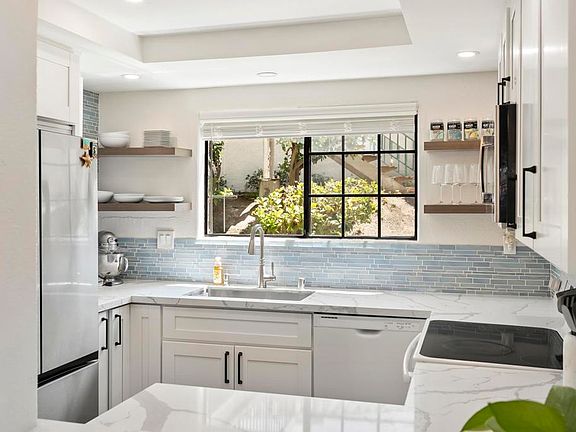 Dreamy single-story condo located in the highly sought-after Bernardo Heights community of Mira La Paz. A bright and spacious three-bedroom, two-bath end unit situated on the ground floor. Recent upgrades include a beautifully renovated kitchen featuring soft-close cabinets and quartz countertops. Seamless luxury vinyl plank flooring runs throughout the home, complemented by an upgraded gas fireplace, fresh paint, trim and baseboards, and designer finishes. The water heater was replaced in 2022. A detached two-car garage provides ample parking and storage. The HOA includes water, trash, cable, internet, and membership to the prestigious Bernardo Heights Clubhouse, which features two pools—including a 25-yard lap pool heated to 82 degrees—a spa, fitness center, playground, tennis courts, and pickleball courts. Sits within the award-winning Poway Unified School District.