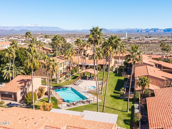 MOVE IN READY...No steps! Lower unit on an elevated lot in one of Fountain Hills most favorite neighborhoods...La Vida Buena. East mountain & fountain views from back patio. Walk to shopping, restaurants & numerous events on ''the Avenue'' or ''Fountain Park''. Shaded front patio offers quiet respite from a busy day or pleasant outside entertaining. Updated kitchen with stainless steel appliances, double oven, counter depth refrigerator & new dishwasher. Both bathrooms updated with large shower in primary bath. Easy care tile throughout. Flawlessly maintained. Private 1 car garage with storage loft & aluminum stair access. Inviting large, heated community pool & spa. A must see!