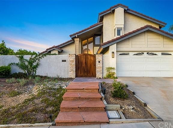 PRIVATE VIA VERDE POOL HOME WITH PANORAMIC VIEWS. Situated on a slightly elevated lot with drought tolerant front landscaping and steps leading up to a private entry gate that opens to a large, concrete courtyard. Double glass entry doors with soaring glass windows above, open into the tiled entryway and to the living room/dining rooms. The tiled entry flooring runs through the remodeled kitchen featuring custom shaker cabinetry, granite countertops from Madagascar, Fulgor-Milano stainless steel range cooktop, convection oven, Kitchen Aid dishwasher, LG refrigerator, Avalon two-zone wine keeper, and an iSioGreen under sink water heater. Enjoy panoramic views from a picture window over the sink, a spacious island with seating, and a family room with a floor-to-ceiling brick fireplace. There is an office/4th bedroom and a remodeled 3/4 bathroom as well on the main floor. Upstairs are three additional bedrooms, the primary bedroom offers double entry doors and open to a spacious bedroom with vaulted ceilings and a sliding door that has panoramic views of the mountains including Mt. Baldy, and over the neighborhood and hills below. The primary bathroom offers dual sinks, shower, and separate tub. Two additional bedrooms upstairs. The backyard features a pool and spa with brick coping, a spacious brick deck area with covered patio, block planters with brick capping, a variety of fruit trees, and spacious side yards. Additional upgrades include; 200amp electrical panel, copper plumbing, solid core doors throughout, and more.