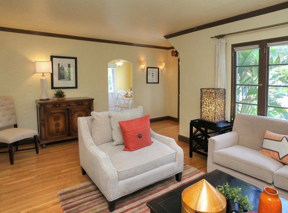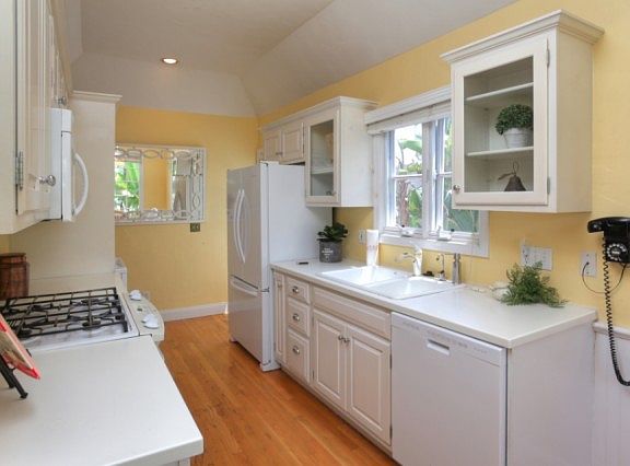 Everything that you would expect to find in a 1929 California Cottage is waiting for you at 1624 Clearview Rd. White picket fence with an arched entry, raised foundation, hardwood floors, wood burning fireplace in the living room, upgraded heating system, upgraded kitchen with a dining nook, bedrooms opening out to a lovely patio overlooking a private backyard, detached garage, and more.