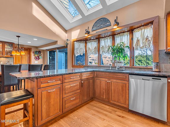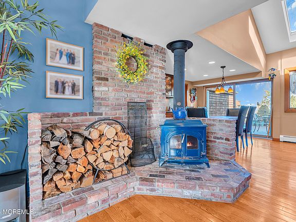 This lagoon-front 4-bed, 3-bath contemporary is filled with natural light and designed for easy waterfront living. The main level offers a versatile layout with a bedroom, full bath, and den perfect for guests, a home office, or multi-generational living. The open living area features soaring ceilings and a cozy wood-burning stove, flowing seamlessly into the kitchen and dining space for easy entertaining.