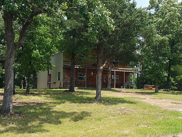 This a 2 story cabin is unfinished in need of lots of finish work. The upstairs is open with the bathroom plumbing in. The Kiamichi River is on the property's south property line at a deep hole that is great for fishing. The view is of the Kiamichi Mountain Range with K-Trail on top. This place is all about recreation. Lots of room inside, heavily tree'd on the outside. Power on, water line passes in front of the house. A water well can be dug or a collection system would also provide well. Surveyed and an easement.