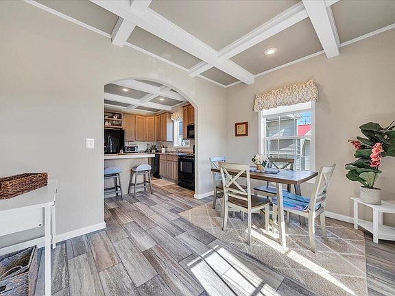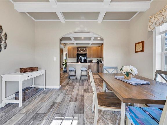 Neat and cozy fireplaceCoffered ceilingCrown molding