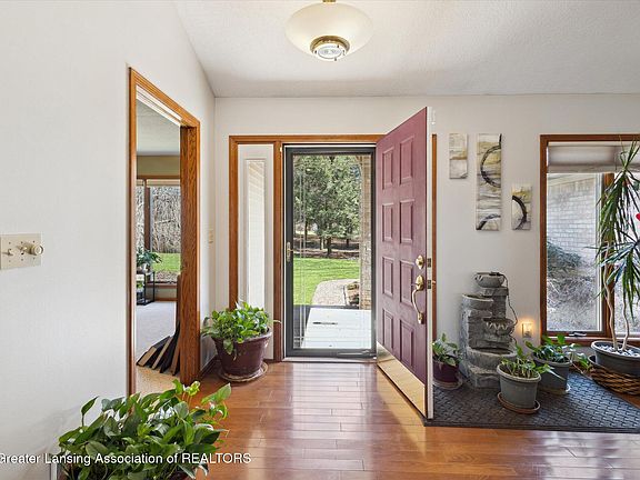 Wonderful ranch on 3 amazing partially wooded acres! Stunning views of nature's best! Beautifully remodeled & quality throughout! Open floor plan & high ceilings! Huge living room w/gas fireplace & double doors leading to large newer deck! Fabulous newer kitchen w/granite countertops, built-in gas stove, stainless steel appliances & numerous cabinets! Spacious primary suite w/updated bathroom featuring, double vanity, glass surround walk-in shower plus walk-in closet! Two additional bedrooms and main bathroom! Updated light fixtures & ceiling fans! Newer flooring throughout; hardwood, carpet & tile! Interior painted, beautiful wood trim & high ceilings! Multiple insulated windows to enjoy the gorgeous views! Full basement w/egress windows & high ceiling! Relax on the deck or in the hot tub while soaking up the sun in this serene atmosphere! Long private driveway to 2.5 car garage plus oversized shed and concrete pad for extra parking! Security system & much more! Great location! Country living, with City convenience! Close to MSU!