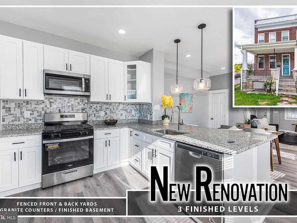 Stunning Renovated End-of-Group Townhome with Welcoming Front Porch! This beautifully updated home offers three fully finished levels of stylish and functional living space. Step inside to an inviting open-concept main level featuring warm wood laminate flooring throughout, perfect for entertaining or everyday living. The spacious living room is anchored by a sleek electric fireplace, adding cozy ambiance and modern flair. The adjacent dining area flows seamlessly into a beautifully updated kitchen with gleaming granite countertops, stainless steel appliances, and ample cabinetry—ideal for any home chef.   Upstairs, you’ll find three generously sized bedrooms filled with natural light and a full hall bathroom with timeless finishes. The finished lower level expands your living space with a large family room, a dedicated office area, and a second full bath—perfect for guests, a home gym, or remote work.  Outdoor living is just as appealing with a private, fully fenced backyard featuring brand-new wood fencing—perfect for relaxing, gardening, or entertaining. A fenced front yard adds charm and curb appeal to this already impressive home. This move-in-ready gem combines classic comfort with thoughtful updates in every corner.