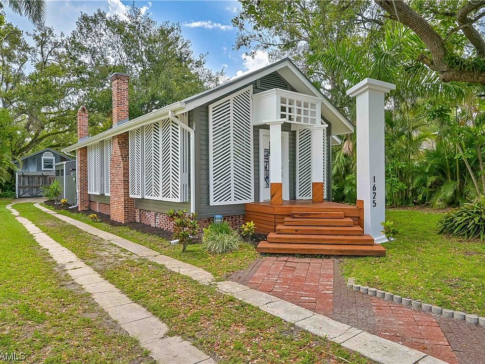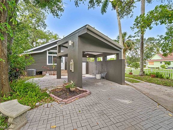 Experience an urban oasis filled with privacy and charm in this vintage bungalow, originally constructed in 1910. Nestled amidst lush, mature landscaping, it offers a serene and secluded retreat. Located in the Historic Fort Myers River District, you're within walking distance of numerous restaurants, galleries, shops, and theaters. The home has been thoughtfully updated with modern amenities, including electrical and plumbing upgrades, a durable metal roof, a whole home surge protector, new gutters, new paint in & out, and retouched landscaping. The home exudes character with original period details such as stunning French Doors in both the formal living room and dining room, hardwood floors recently refinished, high ceilings, and a charming claw foot tub. The 2-bedroom, 1-bathroom floor plan encompasses a den or office, a beautifully renovated kitchen filled with natural light, offering access to a spacious covered patio, and a 200-foot deep lot with ample space for a potential pool. An added bonus is the detached garage, which includes a workshop area and storage on the second floor. Don't miss out on this gem located in a neighborhood renowned for its vintage homes!