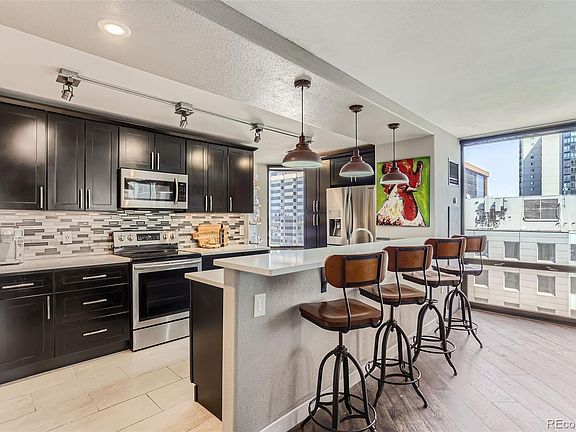 Welcome to this stunning, luxury 2-bed, 2-bath condo in the heart of downtown Denver! This corner unit in the desirable Barclay Tower has been thoughtfully upgraded and boasts gorgeous city views. Upon entering the light-filled space with illuminating floor-to-ceiling windows, eyes are immediately drawn to the brick exposed walls in the living area. An open floor plan flows easily with distressed Pergo wide-plank flooring throughout. The gourmet kitchen is a chef’s dream with quartz countertops, stainless steel appliances and a peninsula with countertop seating. Custom and industrial-style lighting is highlighted throughout, including the chic kitchen pendants. The luxurious primary suite offers soundproofing, large custom closets and a renovated en-suite bath. The 2nd en-suite bedroom has the possibility to use as a workout space or home office. Updates also include window treatments, trim and new doors throughout. The building features a rooftop heated pool, renovated fitness center, 24-hour concierge, community room and plaza gardens with outdoor grills. This unit includes a reserved parking space and a large storage locker. Situated on the corner of Larimer and the newly renovated 16th Street Mall, where you will enjoy the new trees, patio spaces and restaurants. Welcome Home!