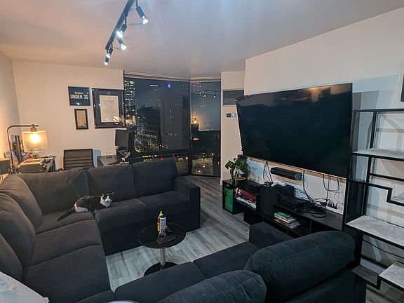 Building amenities include garage parking, a heated sundeck pool, a rooftop gym, a large community lounge, a garden plaza equipped with grills and fireplaces, automated package delivery, a 24-hour concierge, a trash chute, and much more. Rent includes one parking spot, WiFi, cable TV, water, gas, and trash (only electricity is excluded).