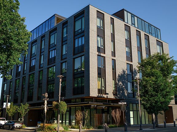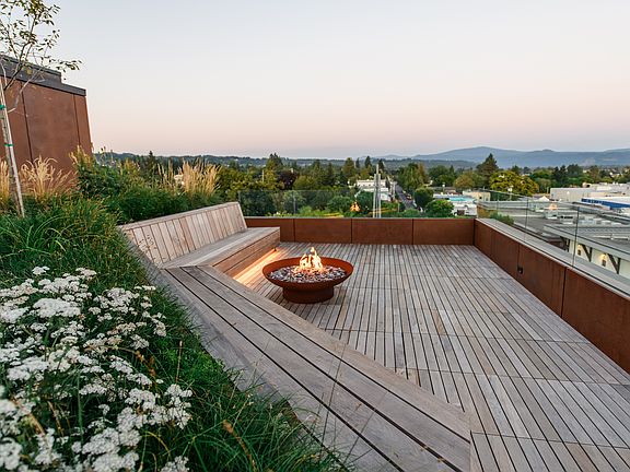 Residents enjoy a rooftop deck with panoramic views of Mount Hood and the Columbia River, a resident lounge with coworking space, and secure building access.