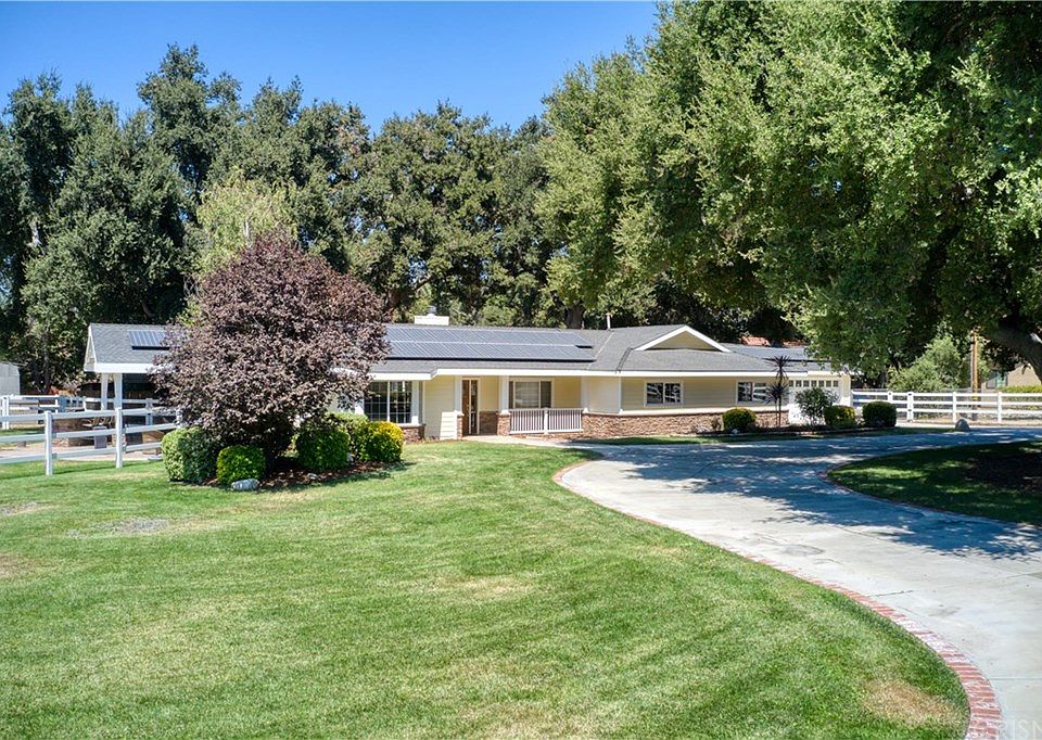 Amazing Single-Story Sand Canyon Home. Featuring 4 bedrooms, 2 baths, 2053 sqft. and just under an acre lot. The curb appeal is out of a picture book with a circular driveway, beautiful Oak trees with white fencing. You will enter a light & bright open floorplan with high ceilings, wood beam, living room (w/stone fireplace & French doors leading to the backyard), custom kitchen and dining area with hardwood floors throughout. The Chefs Kitchen includes granite counter-tops, large center island w/sink, warming drawer, wine refrigerator, stainless steel appliances, custom cabinets and more... Master bedroom has dual closets with custom organizers & upgraded bathroom w/dual sinks and custom shower with steam component. Guest bathroom has been upgraded including jet/spa tub and tile flooring. Bedrooms are spacious and home has been freshly painted throughout. The large backyard is an entertainer's dream, w/covered patio w/speakers, outdoor kitchen, BBQ, pool (with 2 waterfalls) and spa with plenty of yard to play. Also featuring, RV parking with septic hook-up, Smart Home features, electric gates, solar panels, tankless water heater, dual pane windows, central vacuum, and so much more. Quiet neighborhood, convenient location &, great schools. This home has it all!