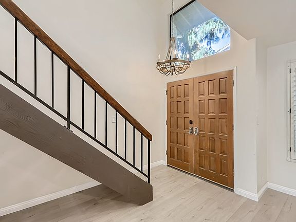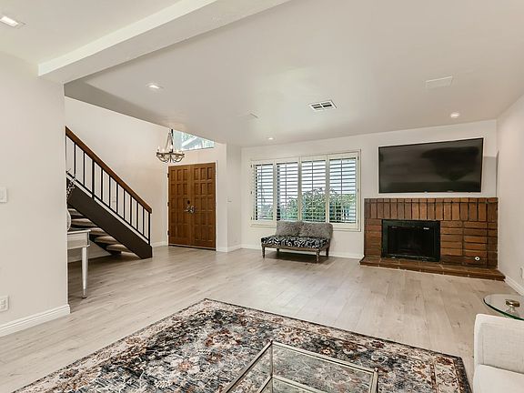 Turn-key two-story townhome with 3 BD/ 2.5 BA unit at the Woodlands in Granada Hills! Nestled midway through the community, it offers tree shaded, park-like setting privacy and a convenient community pool. A ton of upgrades adorn this home including new light wood plank flooring which ushers you into the open living and dining area with brick fireplace. Ample natural light flows through to the living, dining and kitchen area. Sliding doors off the dining room lead to the backyard patio and the detached garage with a new garage door. The U-shaped kitchen offers efficiency and style with its wood cabinetry, KitchenAide stainless steel appliances and granite countertops. Just past the short hallway and half bath, you'll ascend the stairs to the second level and find a well appointed hallway bath with all of the upgrades as well as the primary bedroom with vaulted ceilings, upgraded ensuite bath with European vanities, its own balcony and two additional bedrooms. New garage door compatible work remotely Camera system (CCTV) Front door and backyard Ring intercom, Home automation - smart home Sound System - 1st floor Nest HVAC system. Smart Home features can be controlled far from home with mobile app. Nearby: local shopping and dining, easy access to I-405 and 118 Freeway. Buyer to verify all information.