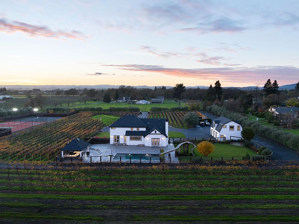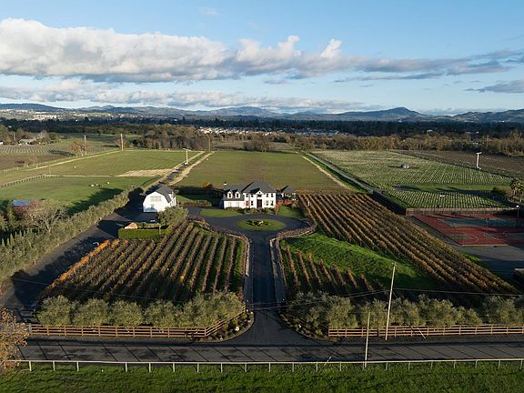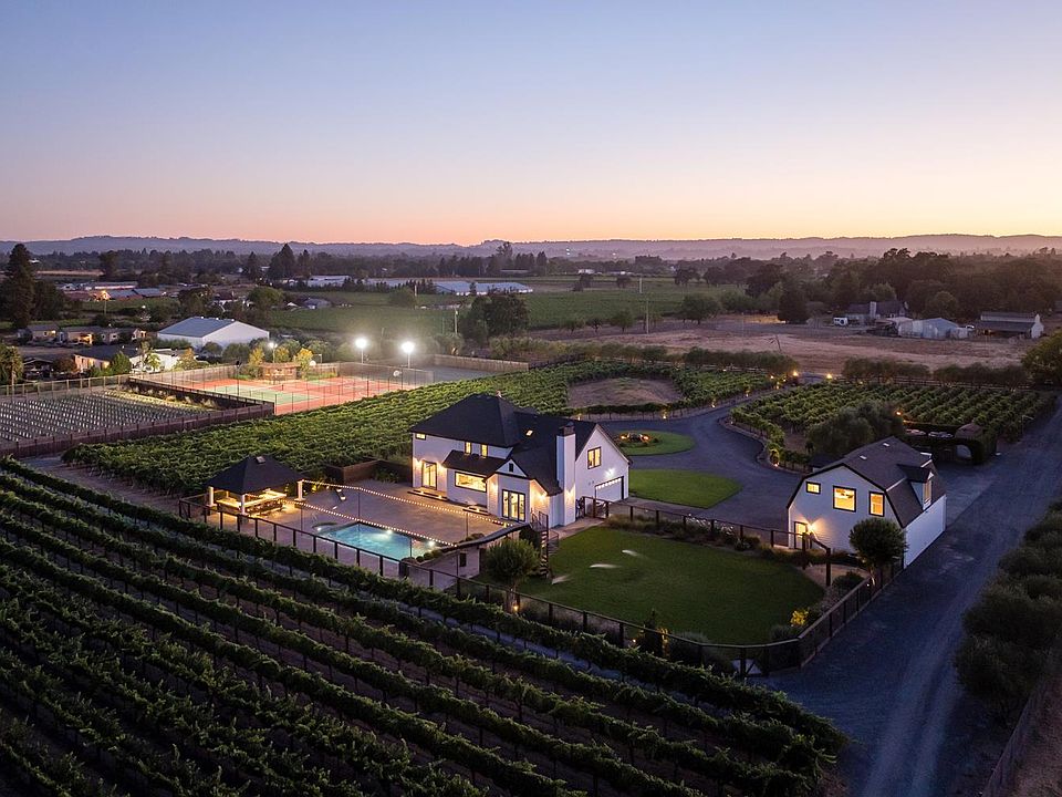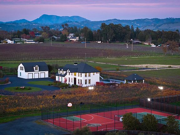 Discover the ultimate Wine Country lifestyle across two adjacent estates at 1626 & 1636 Abramson Road, Santa Rosa. This gated compound in the coveted Russian River Valley AVA offers a rare blend of luxury, leisure, and resort-style living. Set on approximately 17 acres of open space, this property presents exceptional potential and versatility. With replant permits in place for the next 10 years, the land is perfectly positioned for future vineyard development. The expansive grounds are equally well-suited for equestrian pursuits, gardens or expansion. Currently, the property features 1.8 acres of established Syrah vines, offering immediate agricultural appeal and a glimpse of what's possible on this remarkable estate. The main residence, remodeled in 2023, combines modern elegance with timeless warmth. It features light-filled living spaces, a chef's kitchen with premium appliances, a home office, an elevator, and a personal salon. Additionally, there is a carriage house with a full kitchen and one bedroom and one bathroom above a three-car garage. Resort amenities include a pool with a waterslide, spa, and pergola with an outdoor kitchen. The property also boasts lighted tennis and basketball courts, as well as expansive patios with vineyard views, perfect for entertaining. The neighboring estate, rebuilt in 2013 by Harkey Construction, offers a gourmet kitchen with Wolf and Miele appliances, vaulted and beamed ceilings, and a luxurious primary suite. Extensive outdoor living spaces include patios, a pergola, water features, and manicured grounds. Additional highlights include a large barn/workshop with a loft, multiple wells with filtration, and a turn-key compound offering privacy, elegance, and flexibility. Perfectly located near world-class wineries and dining, this estate is a rare opportunity to own a legacy property in Sonoma's Wine Country, suitable for multi-generational living, vineyard pursuits, or a private resort retreat.