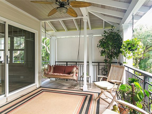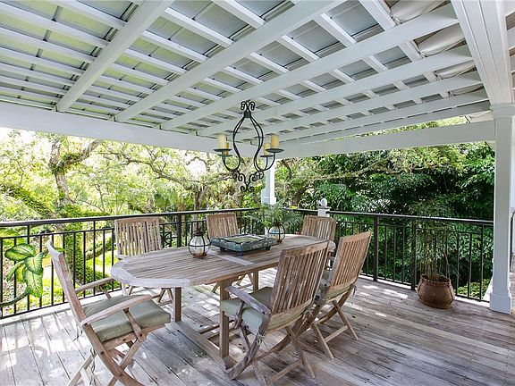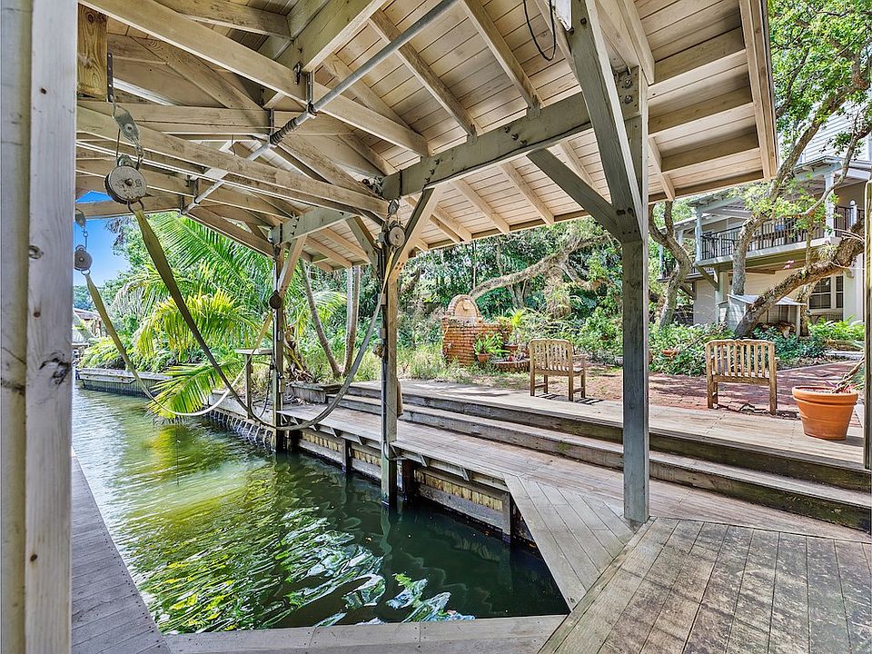 Key west inspired custom waterfront home on lush double lot. Old Florida setting with majestic canopy oaks. Sun filled living room, Master suite with adjacent office/ nursery, wrap around decks with serene water views. Grandfathered boat house with lift & intercostal water access. Detached workshop/ studio & Mother-in-law suite located on ground floor. This home has endless options. Rm sizes approx/subj to error.