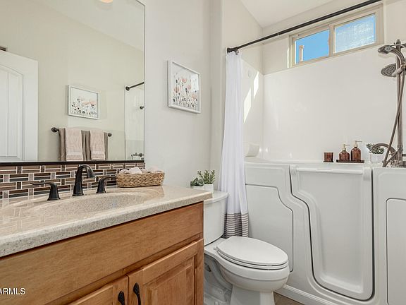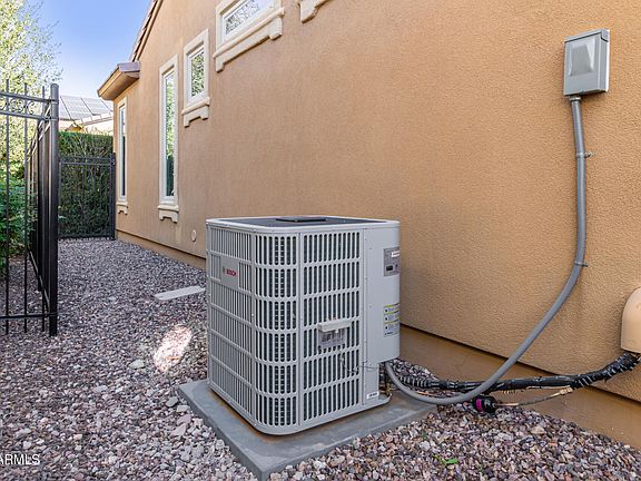 Discover a blend of comfort, efficiency, & Encanterra® luxury gated golf course community living. This well maintained home has been upgraded with a brand-new 2025 HVAC system (5 Ton 18 SEER & 96% Furnace). New 2025 carpet, 2025 dishwasher & 2024 water heater. Enjoy the peace of mind that comes with a 7.5 kW solar system, designed to enhance efficiency & reduce energy costs. The 2nd bathroom features a luxurious Safe Step Walk-In Tub, blending safety & relaxation for a true spa-like experience, installed 2024. A sliding glass wall door that opens to an outdoor patio featuring a cozy fireplace, electric sunshade screen, built-in BBQ grill & fenced backyard. This home offers access to resort-style amenities, including fine dining, golf, pickleball, fitness centers, pools, & a social scene. Buyer to verify all material facts and measurements.