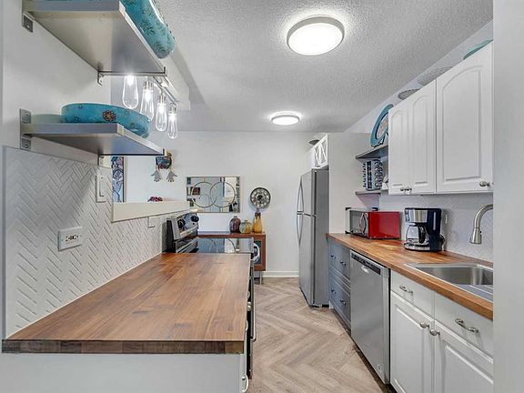 Updated kitchenHerringbone tile backsplashWood countertopsStainless steel appliancesPrivate balconySpacious bedroomLarge walk-in closet