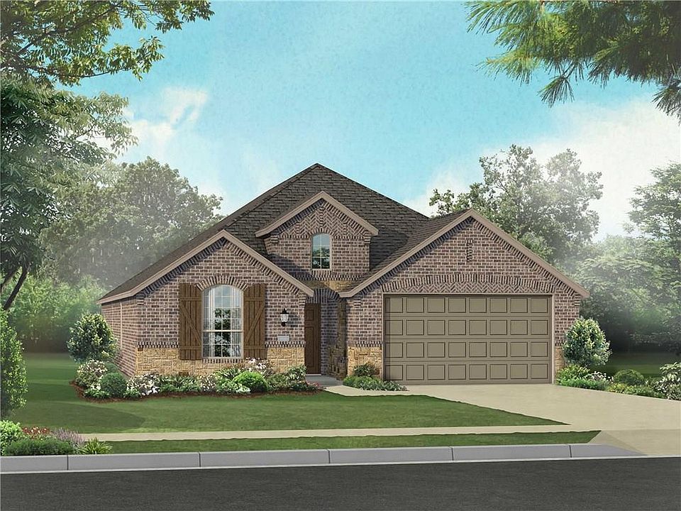 MLS# 13898563 - Built by Highland Homes - November completion! ~ Stunning single story home on corner lot with no home directly behind, bright kitchen with built in cooktop, oven, microwave, granite countertops with Pewter painted cabinets, direct vent stone fireplace with raised hearth and gas logs, Luxury vinyl plank flooring throughout except for bedrooms, covered outdoor living, near new amenity center and elementary school..
