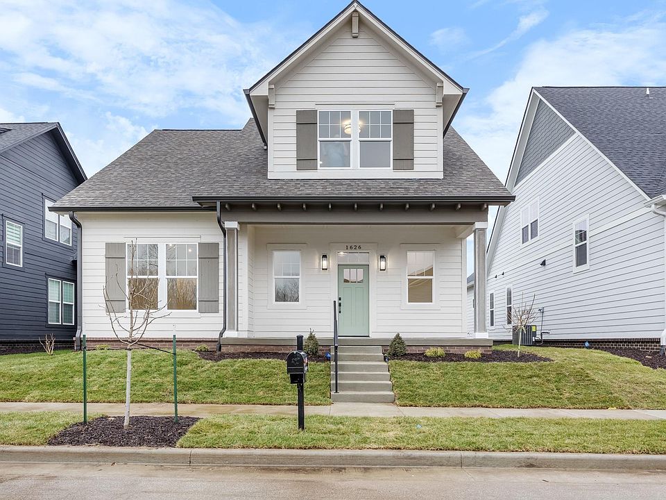 Welcome home to this stunning semi-custom craftsman bungalow in West Lafayette's coveted neighborhood, Provenance, at the edge of Purdue campus! On a lot facing the central greenspaces, this home has the custom features you'd expect! Open floor plan with 10 foot ceilings throughout, luxury vinyl plank flooring, granite counters, custom cabinetry, a full suite of stainless appliances with microwave drawer, gas cooktop, convection oven, chimney hood vented to the outside, and spa-like primary bathroom with dual sinks, spacious walk-in tiled shower, split bedroom floor plan, outdoor covered living patio. Two bedrooms and a full bath upstairs with 9' ceilings. Tankless water heater and security system included. You'll love the luxury finishes and the neighborhood amenities of Provenance! Clubhouse with pool will be available in the near future!