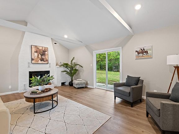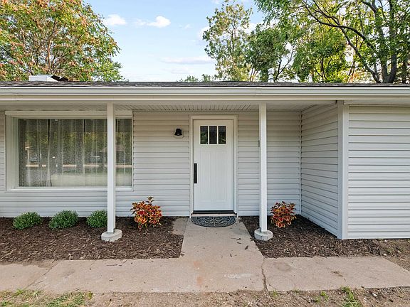This stunning, fully renovated 3-bedroom, 2-bathroom ranch home offers modern living with timeless charm. Nearly zero-entry, this home welcomes you with brand-new luxury vinyl plank flooring that flows seamlessly throughout the spacious living area, highlighted by vaulted ceilings, exposed beams, and a beautiful brick wood-burning fireplace. The home is constructed of solid cinder block with a vinyl exterior. The brand-new kitchen is a showstopper, featuring matte black finishes, new cabinetry, and stainless steel appliances—perfectly positioned next to the separate formal dining area for easy entertaining. The master suite includes dual closets and a gorgeous en suite bathroom with a separate walk-in shower. Enjoy peace of mind with a new roof, all-new plumbing and electrical, fresh interior paint, and updated finishes throughout. Additional features include a main-floor laundry room, detached 2-car garage, circular driveway with RV parking, and no HOA—giving you the flexibility and freedom to make it your own. Spacious secondary bedrooms and a generous lot make this move-in ready home a rare find. Schedule your showing today!