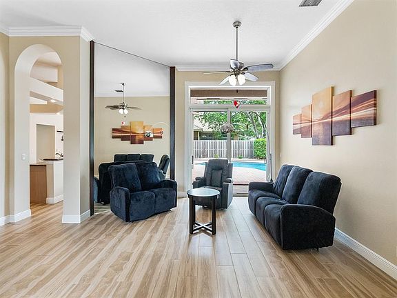 Welcome to Estates of Stirling Lakes, the home you have been waiting for. This highly desired pool home on an oversized Cul du Sac lot, a one-story modern home, beautifully renovated 4 Bedroom & 3 Bathrooms, offers indoor-outdoor living. Dramatic arch accented foyer entry & volume ceilings. The open floor plan allows for the kitchen to extend to the large family room that leads to the outdoor area and formal dining room - ideal for entertaining! Spacious Master Suite with ensuite Bathroom. Triple split bedroom layout. The home is on an 11,287 ft lot, three-car garage, & impact windows in a quiet gated community. Extensive landscaping and a huge paved driveway for 9 cars. 2024 Roof. Freshly paint. New appliances. Low HOA dues within walking distance to top-rated elementary.