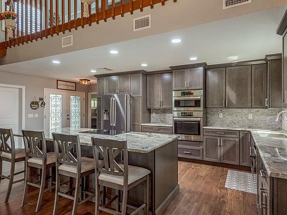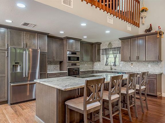Welcome to your own private oasis on a sprawling 1.17-acre estate lot where freedom meets luxury. This beautifully updated 3-bedroom, 3-bathroom home offers 2,330 square feet of thoughtfully designed living space with absolutely no deed restrictions and no flood insurance required. The heart of this home features a gorgeous kitchen showcasing a center island, premium Bosch appliances, rich wood cabinetry, and elegant stone countertops. Ceramic wood floors flow seamlessly throughout, while French doors add a touch of sophistication. The impressive living room spans an enormous 25.7 x 26.10 feet and boasts a stunning stone wood-burning fireplace, soaring vaulted ceilings, and architectural windows that line the back of the home, creating a dramatic backdrop. Spacious dining room with plenty of room for everyone. The primary bedroom provides a peaceful retreat with its own private bathroom, while the loft area adds versatility for various lifestyle needs. The additional bedrooms are generous in size. Step outside to discover your personal entertainment paradise. The inviting screened-enclosed lanai surrounds an inground pool, while the dream outdoor pavilion kitchen and bar area transforms any gathering into an unforgettable experience. Talk about bringing the party to your backyard. Car enthusiasts will appreciate the unique 5-car garage, complemented by an additional building perfect for workshop or storage needs. This property welcomes Recreational Vehicles, Boats and Work Vehicles. Privacy abounds on this exceptional property, offering tons of space to breathe and relax. Do not miss viewing this beautiful home!