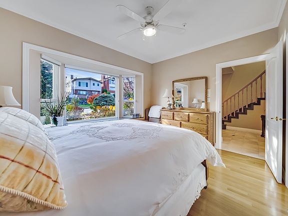 Must-see, one-of-a-kind custom-built home in like-new condition with downtown and mountain views in the desirable Knight/Victoria area. This one-owner beauty offers two top-floor bedrooms and a family room with a gorgeous fireplace to maximize the views. Marble and granite throughout, including stairs, both kitchens, and all bath counters. Main kitchen features a Sub-Zero fridge, solid oak cabinets, and built-in vacuum. Primary ensuite has jetted tub and bidet. Oak double doors, 2x6 construction, ¾" hardwood on main and upper floors, crown mouldings, and 7-zone radiant heat. Basement has a huge rec room, quality kitchen with gas stove, and 4-pc bath. Double garage supports a massive deck. Yard includes monkey, fig, grape, and kiwi trees. Walk to Kensington Park.