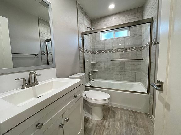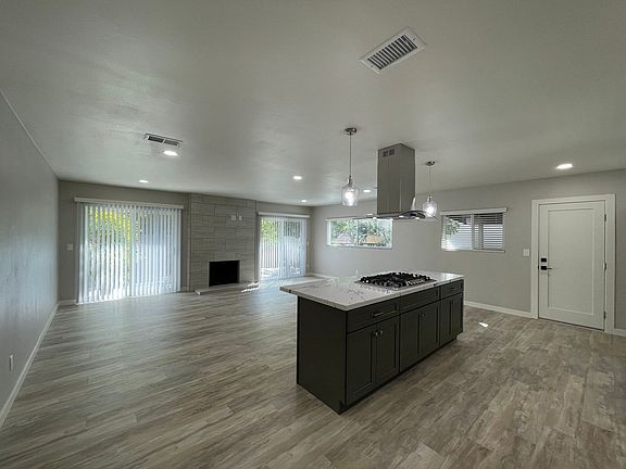 This spacious 4-bedroom, 2-bathroom home has been beautifully redesigned and renovated for the ultimate living experience. The open-concept floorplan offers a family-friendly environment that is great for relaxing or entertaining. Upon entering, you are greeted by a large living room with a decorative fireplace and two sliding doors, with direct access to the backyard. The sleek, composite engineered flooring throughout gives the home an elegant feel. Bring out your inner chef in the gorgeous kitchen equipped with new marble countertops, pendant lighting, and top-of-the-line "Frigidaire Gallery" suite of appliances, which include gas burning cooktop, double oven, stainless steel dishwasher, refrigerator, and washer/dryer (in garage). All kitchen cabinets are solid wood, soft close, and enhanced with designer fixtures. LED recessed lighting throughout the home helps glamorize all the wonderful touches, especially in the renovated full bathrooms. No compromises when it comes to comfort in this home; it features a new HVAC system, ceiling fans in every room, and double-paned windows. 2-car garage with additional parking in the driveway as well as street. Pet-friendly home (breed restrictions apply and pet deposit required). Tenant pays all utilities. Tenant also responsible for maintenance of landscaping.