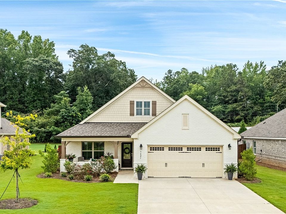 From the welcoming front porch designed for gathering to the exceptional backyard retreat, this home has been thoughtfully planned inside and out. The main level offers effortless single-story living with open, connected spaces, while a versatile upstairs bonus room—or fourth bedroom—with a private half bath adds valuable flexibility. The foyer opens to a vaulted living room accented by beams and anchored by a gas fireplace framed by windows. The adjacent kitchen boasts white cabinetry, quartz countertops, a gas range, an island with double-sided storage and an inset sink, a walk-in pantry, coffee bar, & a chic backsplash. A generous dining area is easily accessible from both the kitchen and living space. The rear primary suite overlooks the backyard; the bed is flanked by windows, and an electric fireplace adds ambiance. The bath features a frameless walk-in tiled shower, a roomy soaking tub, a water closet, & a custom primary closet. Two additional bedrooms with spacious closets share a well-appointed hall bath on the main level. Upstairs, a versatile and well designed bonus room or flex space is large enough to serve as a bedroom and office or rec room, and a convenient half bath adds to its functionality. An oversized laundry room with built-in cabinetry has ample space for a folding table or drop zone. Outside, the owners have created an extraordinary retreat. A cedar covered-porch with lighting and a ceiling fan sets the stage for outdoor living, while planters, raised Vego garden beds, and lush landscaping provide year-round color and privacy. A discreetly placed hot tub with tasteful privacy screens and ample open lawn for play or entertaining complete the backyard haven.